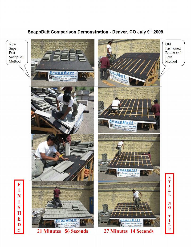 SnappBattTM tile roofing shims beat the socks off the old fashioned batten and lath installation!  Entire deck completely tiled in under 22 minutes using the SnappBattTM shims while even after 27 minutes, not a single tile had been laid using the old fashioned batten and lath.